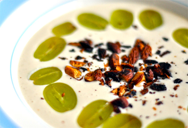 Esta sopa es una fría. Compuesta de ajo, aceite, almendras crudas sin piel, miga de pan, vinagre y sal. Si las almendras tienen piel es necesario dejarlas en remojo toda la noche. La preparación se inicia machacando las almendras en un mortero con los ajos hasta conseguir una pasta que se va ligando con el aceite de oliva virgen extra. A esta base se le incorpora el agua fría — con cuidado de que no se nos corte — el vinagre y la sal. Se sirve con unas uvas moscatel dentro de la misma sopa.