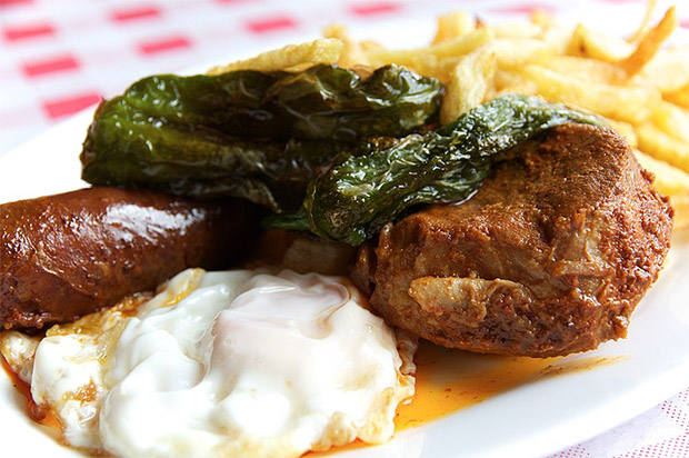 Es, quizás, el plato emblema de las ventas de Málaga. Un taco de lomo de cerdo en manteca «colorá» servido con chorizo, morcilla, patatas, huevos y pimientos verdes fritos. Un contundente plato cuyo origen parece estar en la energética comida que se le servía a los arrieros que cruzaban la montañosa provincia de Málaga allá por los años 30 del pasado siglo. Si, es plato único.